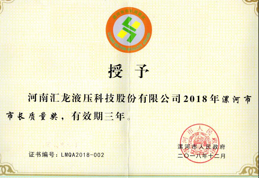 喜獲捷報,匯龍液壓獲得2018年度“市長質(zhì)量獎”這個沉甸甸的榮譽!