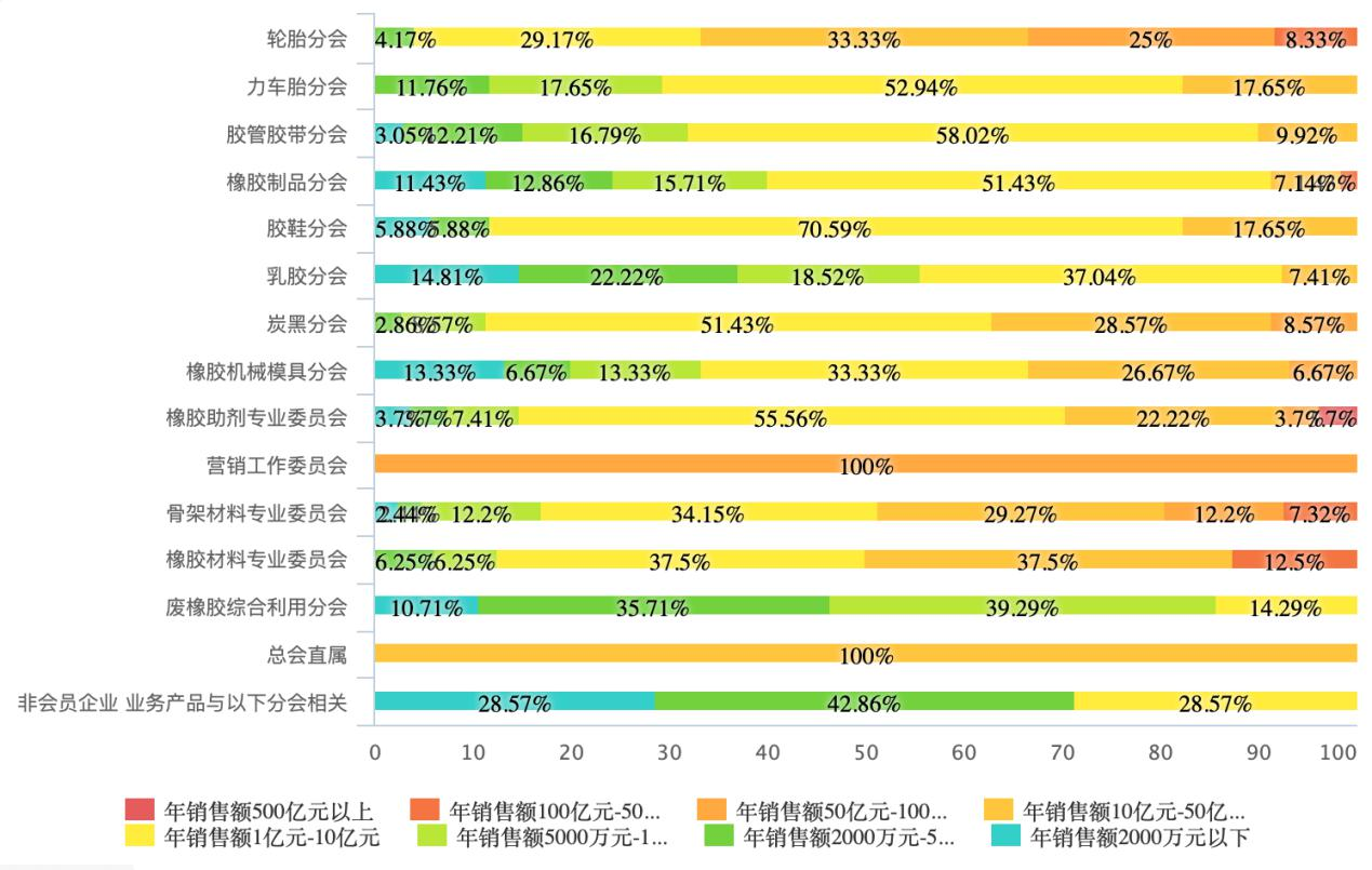 根據(jù)分會及專委會細分行業(yè)不同,企業(yè)經(jīng)營規(guī)模有差異,橡膠行業(yè) 422 家參與調(diào)研答卷的企業(yè)中,45.26%的企業(yè)年銷售額在 1億-10 億元區(qū)間內(nèi);15.17%的企業(yè)年銷售額在 10 億-50 億元區(qū)間內(nèi);14.93%的 企業(yè)年銷售額在 5000 萬-1 億元區(qū)間內(nèi),其余如圖 3 所示。