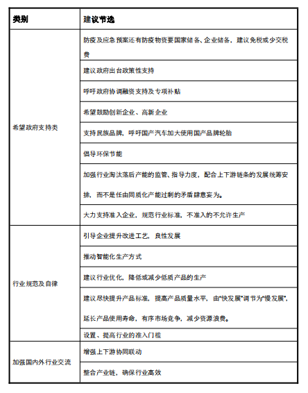 期望政策方面:取消天然橡膠進口關(guān)稅、降低制造業(yè)稅收、解決物流運輸通道受限的情況、政府機構(gòu)因疫情影響延遲交貨的違約責任劃清、減少行政類管控等;