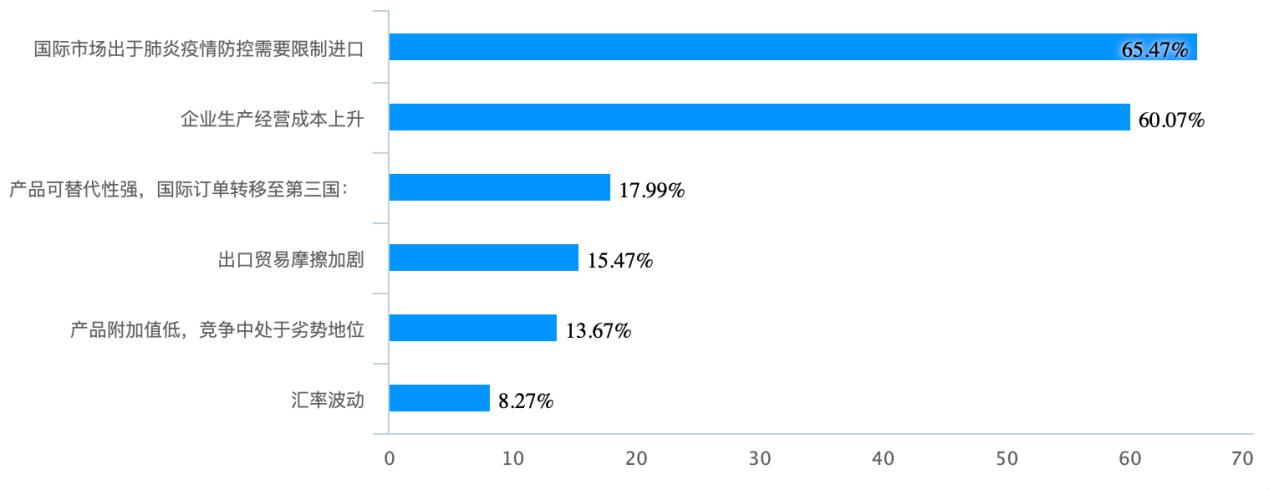 另外,此次疫情對企業(yè)后續(xù)發(fā)展的影響主要還體現(xiàn)在:訂單延期交付(329 份,77.96%);意向訂單減少(247 份,58.53%);企業(yè)用工困難(228 份,54.03%);產(chǎn)品出口受阻(155 份,36.73%)。