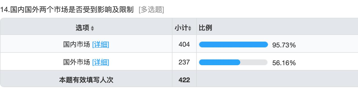 422 份問卷中,404 份認為國內(nèi)市場受到了嚴重的影響,占比為95.73%(2 月 12 日時,250 份問卷中有 238 家企業(yè)認為國內(nèi)市場受嚴重的影響,當時的占比為 95.2%,隨著時間的推移,很多企業(yè)也在逐漸恢復生產(chǎn),努力減少疫情帶給企業(yè)的損失,但國內(nèi)市場仍有災(zāi)難性的影響。),同時有 237 份問卷,占比為 56.16%的企業(yè)也認為國外市場也受到到了不同程度的影響。