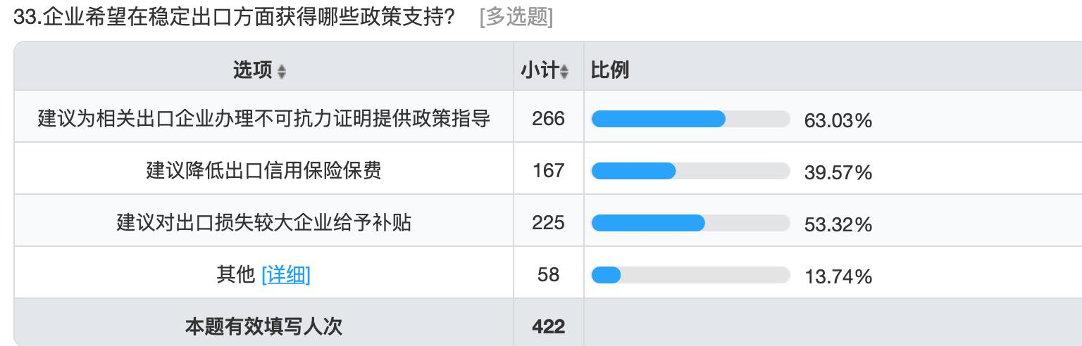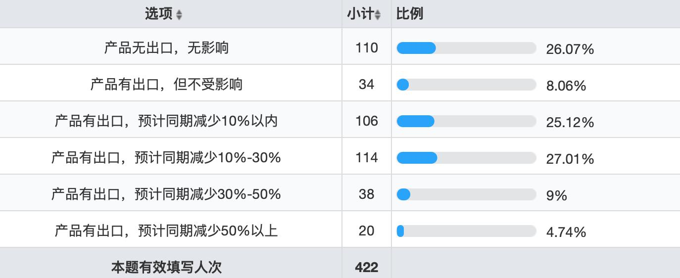 422 份問卷中,約 110 家企業(yè)無出口,占比為 26.07%,主要銷往國內(nèi)市場;其余 312 家參與答卷的企業(yè)有出口業(yè)務(wù),其中有 34 家企業(yè)或因產(chǎn)品不可替代、或因海外有工廠,迅速調(diào)整了布局、或因工廠靠近港口出貨便利等原因,出口沒有受到影響,其余企業(yè)均有著不