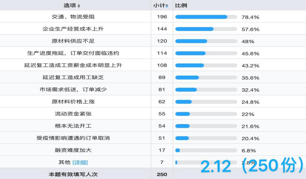 “這一突出棘手的問題,也由 2 月 12 日占比 78.4%的企業(yè)反饋,到十日后 2 月 21 日占比降為 78.31%,到問卷截止時,這一占比為78.2%。從這組數(shù)據(jù)上可以看出:隨著有序復工的推進,國家和地方在交通運輸、物流上出臺了相應(yīng)的政策支撐,使交通、物流受阻得以