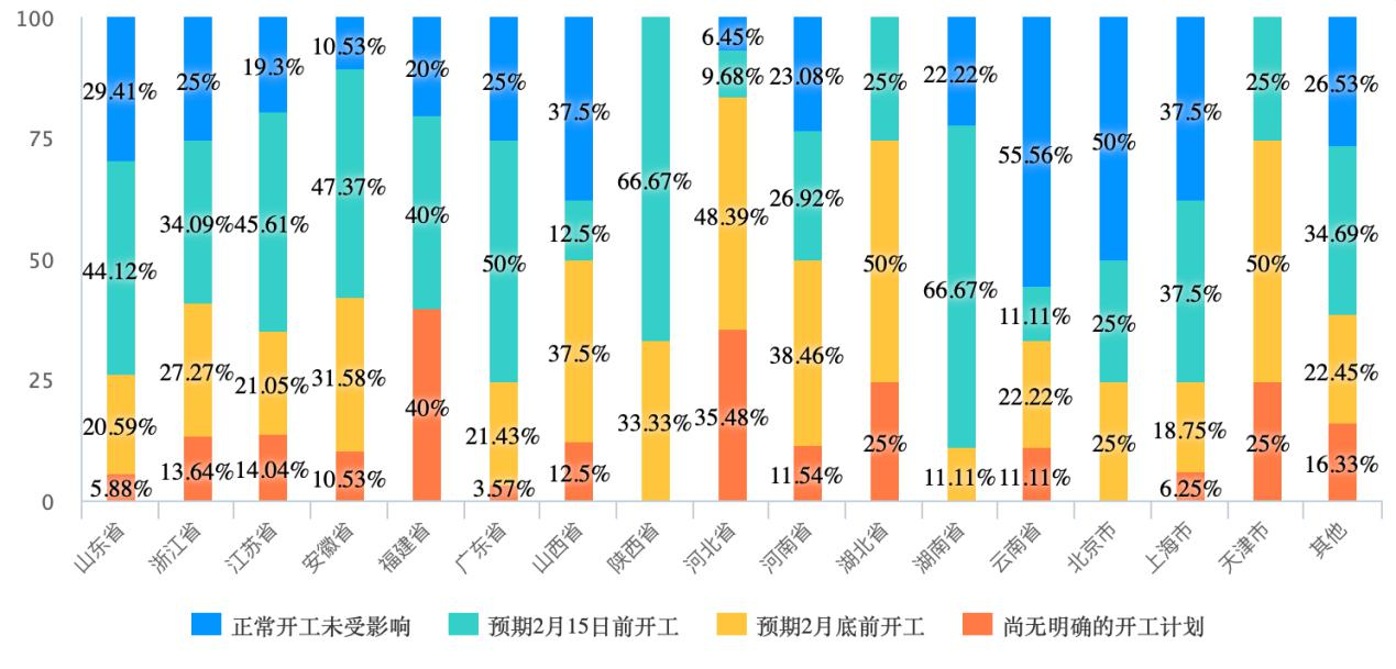 另外,可以從下圖 6 中看出各省市的開工情況,受影響比較大的省份和地區(qū)有湖北、福建、河北、天津等。