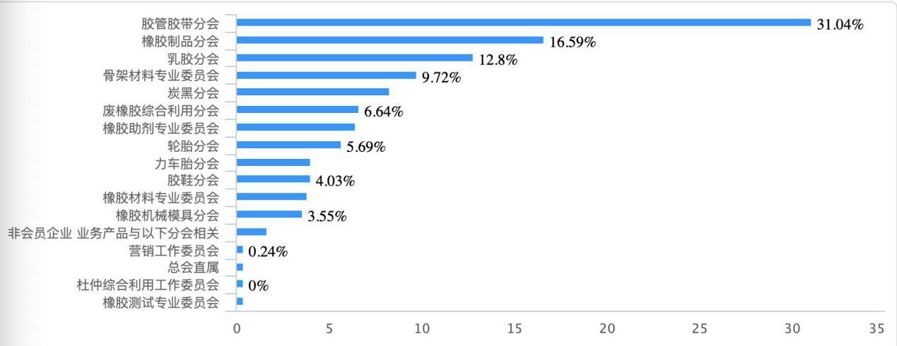 422 份問卷填報企業(yè)中,131 家來自膠管膠帶分會,占比為 31.04%;70 家來自橡膠制品分會,占比為 16.59%;54 家來自乳膠 分會,占比為 12.8%;骨架專委會分會有 41 家,占比 9.72%;炭黑 分會和廢橡膠綜合利用分會分別為 35 家和 28 家,占比分別為 8.29% 和 6.64%;橡膠助劑專委會有 27 家企業(yè)填報,占比為 6.4%;輪胎 分會有 24 家填報,占比 5.69%;力車胎分會、膠鞋分會均有 17 家 企業(yè)填報,占比 4.03%;橡膠材料專委會有 16 家企業(yè),占比 3.79%; 橡膠機械模具分會 15 家企業(yè)填報,占比 3.55%。見下圖 1。