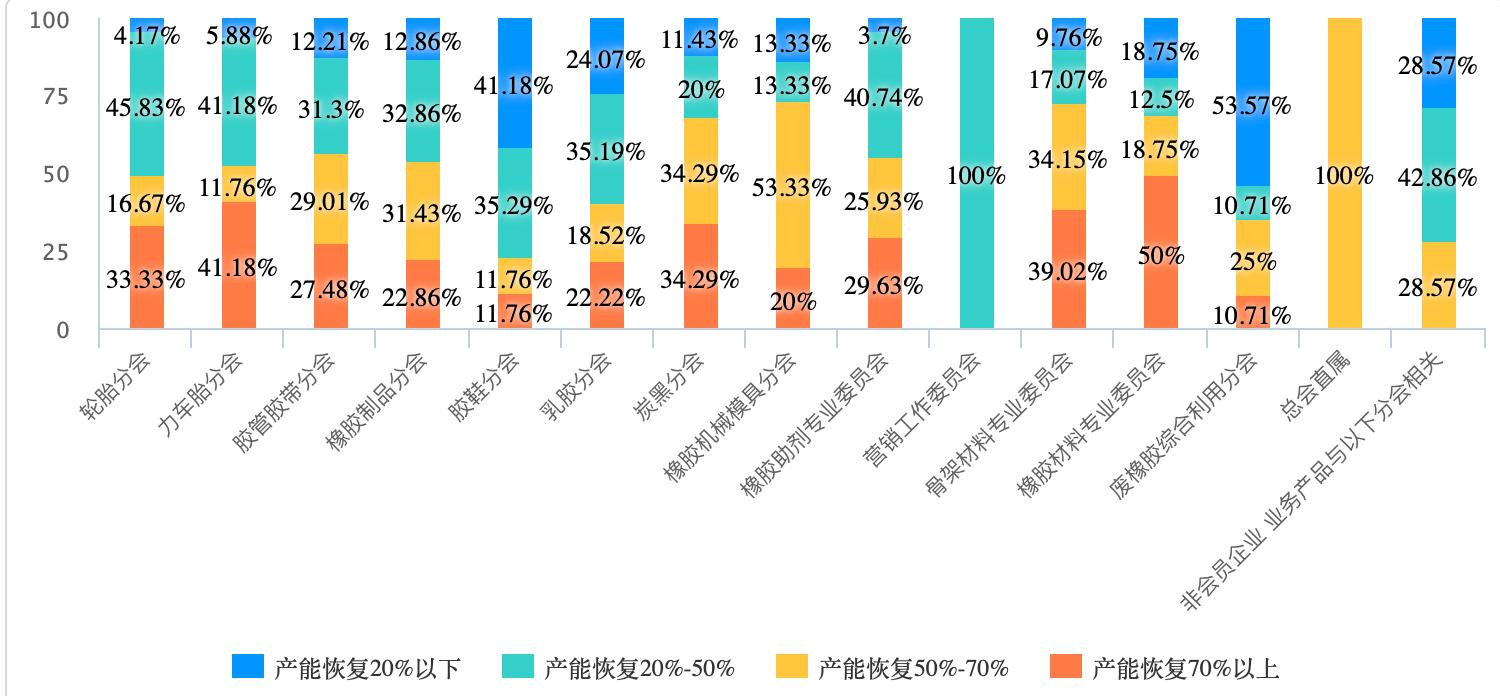 另外,從下圖 7 我們可以看出按照橡膠行業(yè)各細分行業(yè)看,我們的各分會及專委會會員的 2 月底前的產(chǎn)能恢復情況,產(chǎn)能情況恢復較好的有橡膠材料企業(yè)、骨架材料鋼簾線行業(yè)、炭黑行業(yè)等,需要說明的是受限于各分會及專委會的填報數(shù)量不同,企業(yè)類型不同,所以此項情況僅供參考。