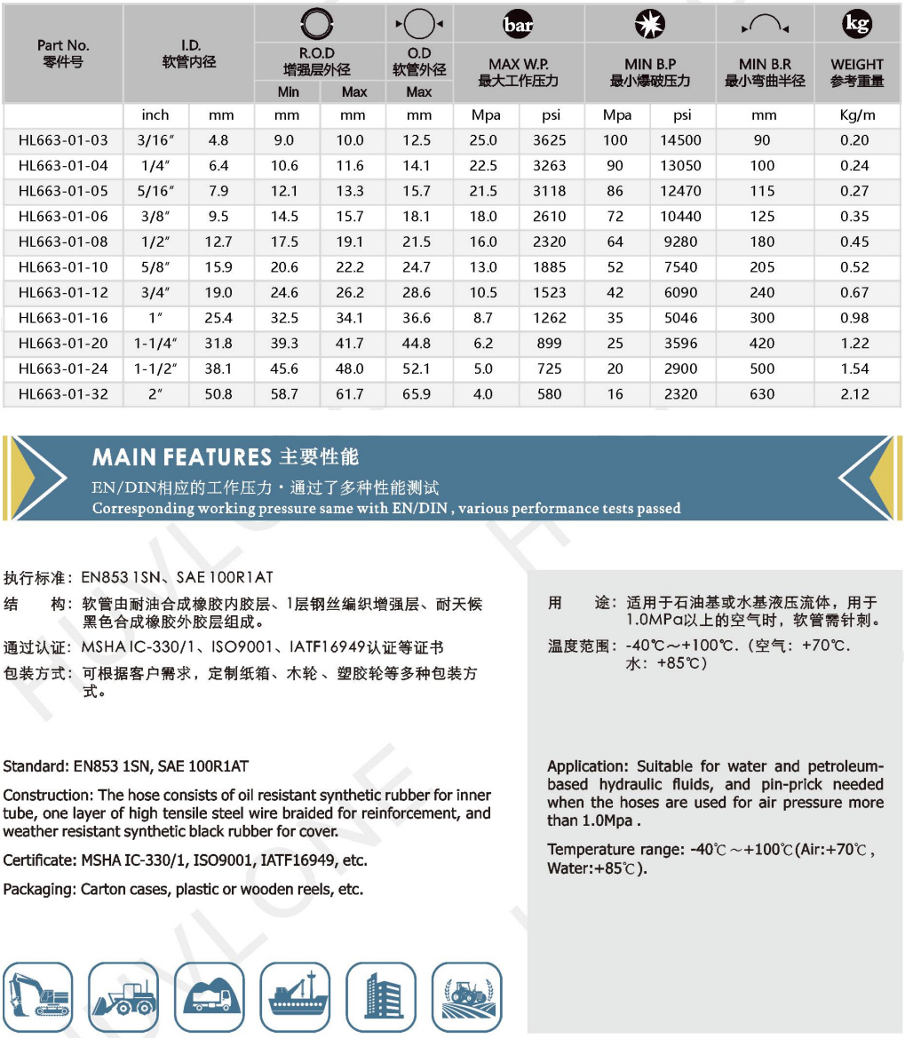 產(chǎn)品用途:適用于石油基或水基液壓流體,用于1.0MPa以上的空氣時(shí),軟管需針刺。