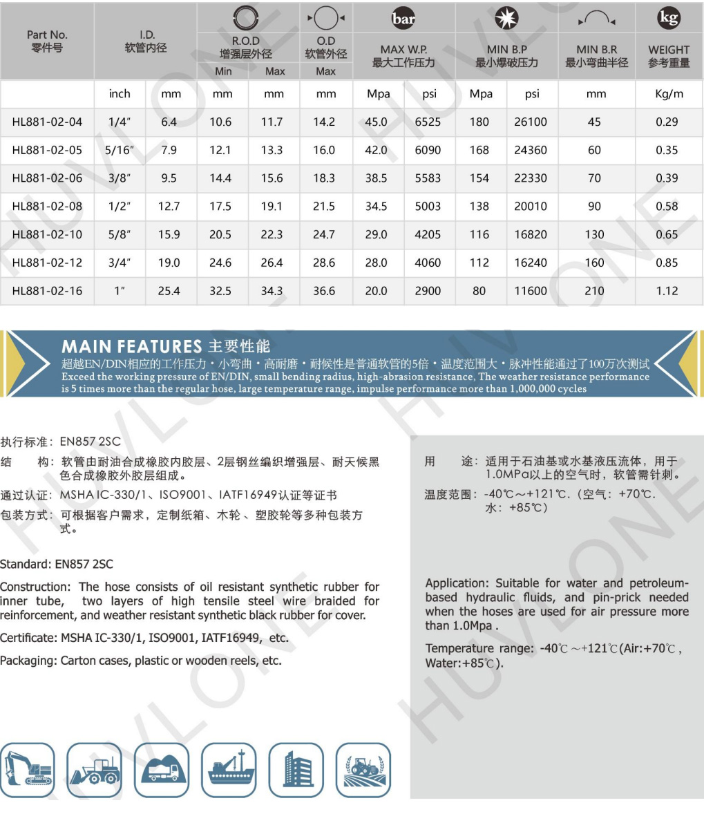 符合/超越DIN EN857 2SC二層鋼絲編織橡膠軟管