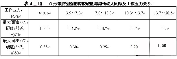 在橡膠材料標(biāo)準(zhǔn)中,以硬度和壓縮永久變形兩項(xiàng)性能最為主重。選擇壓縮變形較小的橡膠材料對(duì)密封性能是有利的,而硬度對(duì)于O形橡膠密封圈耐壓和抗擠又是至關(guān)重要的。根據(jù)國(guó)內(nèi)標(biāo)準(zhǔn)和實(shí)踐經(jīng)驗(yàn),橡膠在規(guī)定溫度下的壓縮永久變形最大不超過(guò)50%。而橡膠的硬度與密封工作壓力密切相關(guān),壓力越高,硬度也是越高;參見表4-1-11