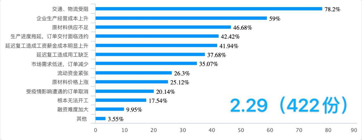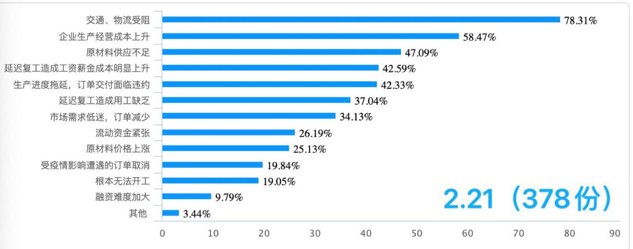 “這一突出棘手的問題,也由 2 月 12 日占比 78.4%的企業(yè)反饋,到十日后 2 月 21 日占比降為 78.31%,到問卷截止時,這一占比為78.2%。從這組數據上可以看出:隨著有序復工的推進,國家和地方在交通運輸、物流上出臺了相應的政策支撐,使交通、物流受阻得以