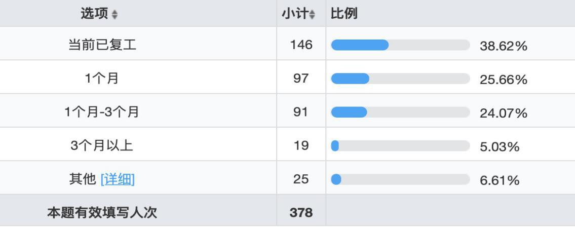 企業(yè)承受期限調查項中,按照填報時間進度,當時時點的復工率 由 2 月 12 日填報 250 份問卷時的 32%,到十日后填報 378 份問卷 時上升到 38.62%,到 2 月底復工率達到填報總數 40.28%,反映了 橡膠行業(yè)企業(yè)自強不息,逐漸努力恢復生產經營。